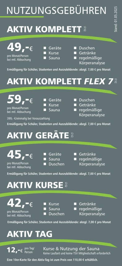 Unsere aktuelle Übersicht zu unseren Nutzungsgebühren findet ihr hier. Voraussetzung ist eine aktive Mitgliedschaft im TSV Hüttlingen. Die Mitgliedbeiträge für den TSV Hüttlingen gibt es hier.